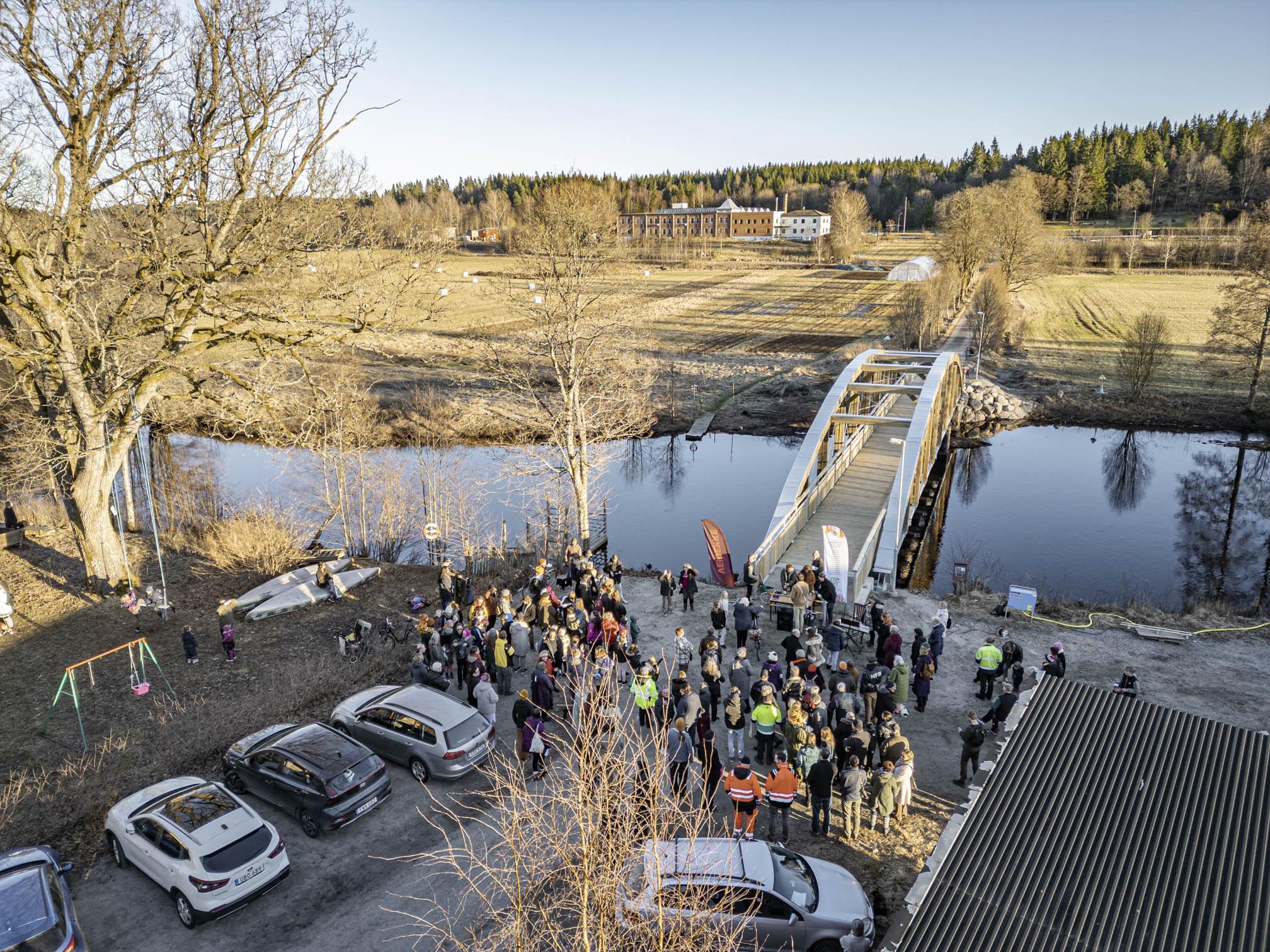 I fyra år väntade vi på en ny bro efter att den gamla rasade 2020. Den 7 mars 2024 kunde vi äntligen inviga den nya bron som binder ihop skuggsidan och solsidan och återigen bildar ett gångstråk runt byn. 150 personer deltog i firandet som bestod i tal, poesi, skål, punchrullar, fanfar, kör, bandbinding, tomtebloss och dragspelsmusik utomhus, och därefter soppa och princesstårta inne i Gula huset.