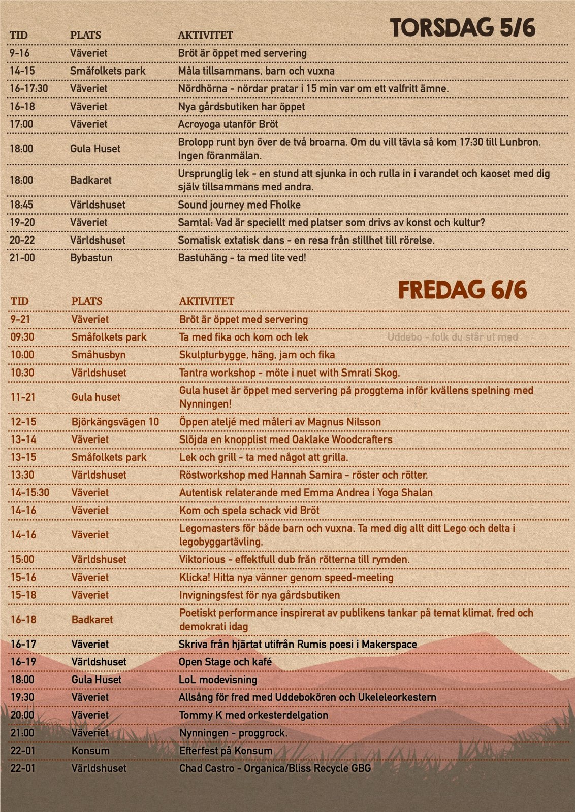 Den 5–8 juni 2025 fyllde vi Uddebo med liv och rörelse, där gator, trädgårdar och mötesplatser blir scener för musik, dans, mat, workshops och kreativa upptåg. Vi samlas för att dela vår konst och inspiration inför varandra.